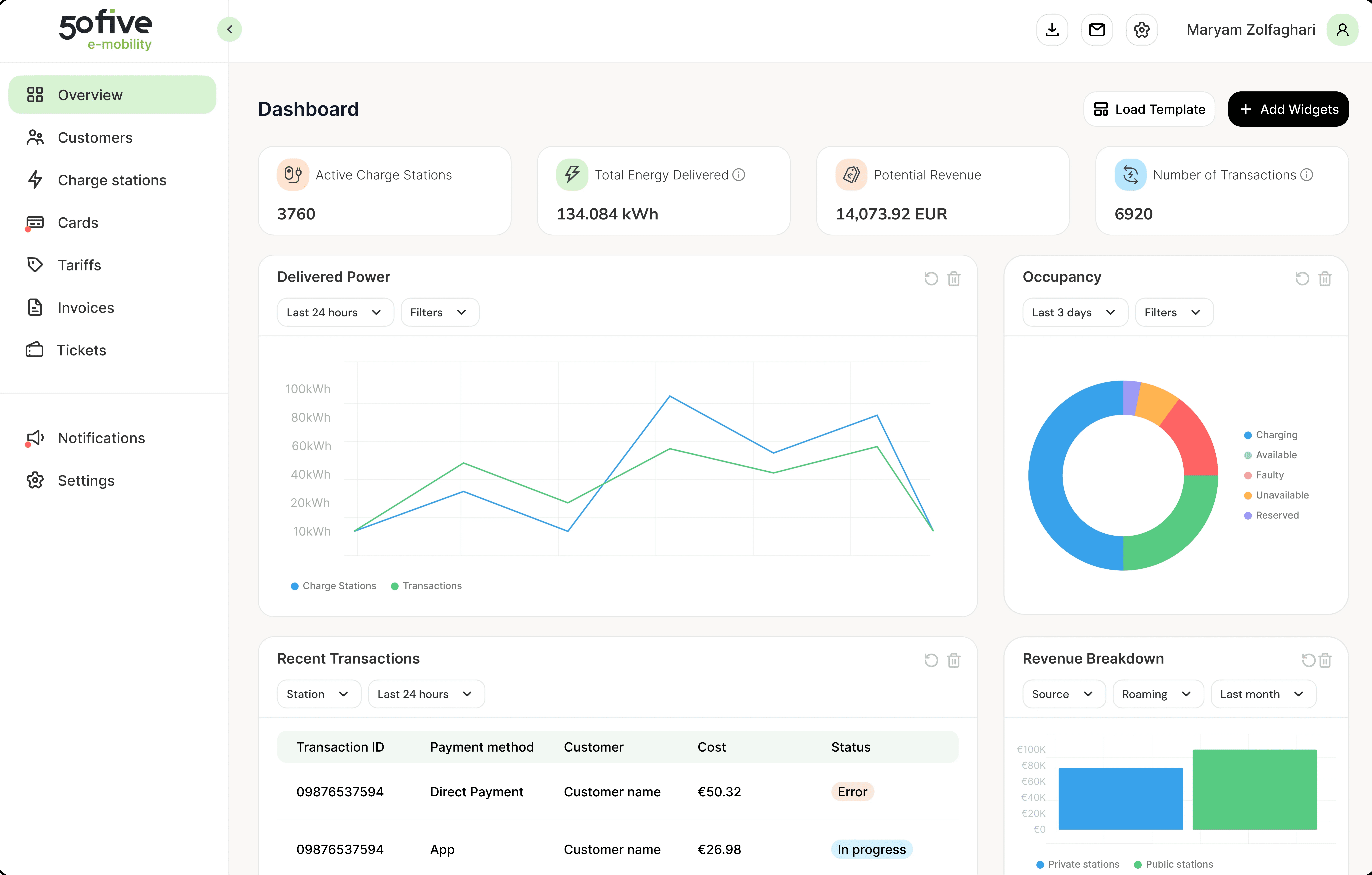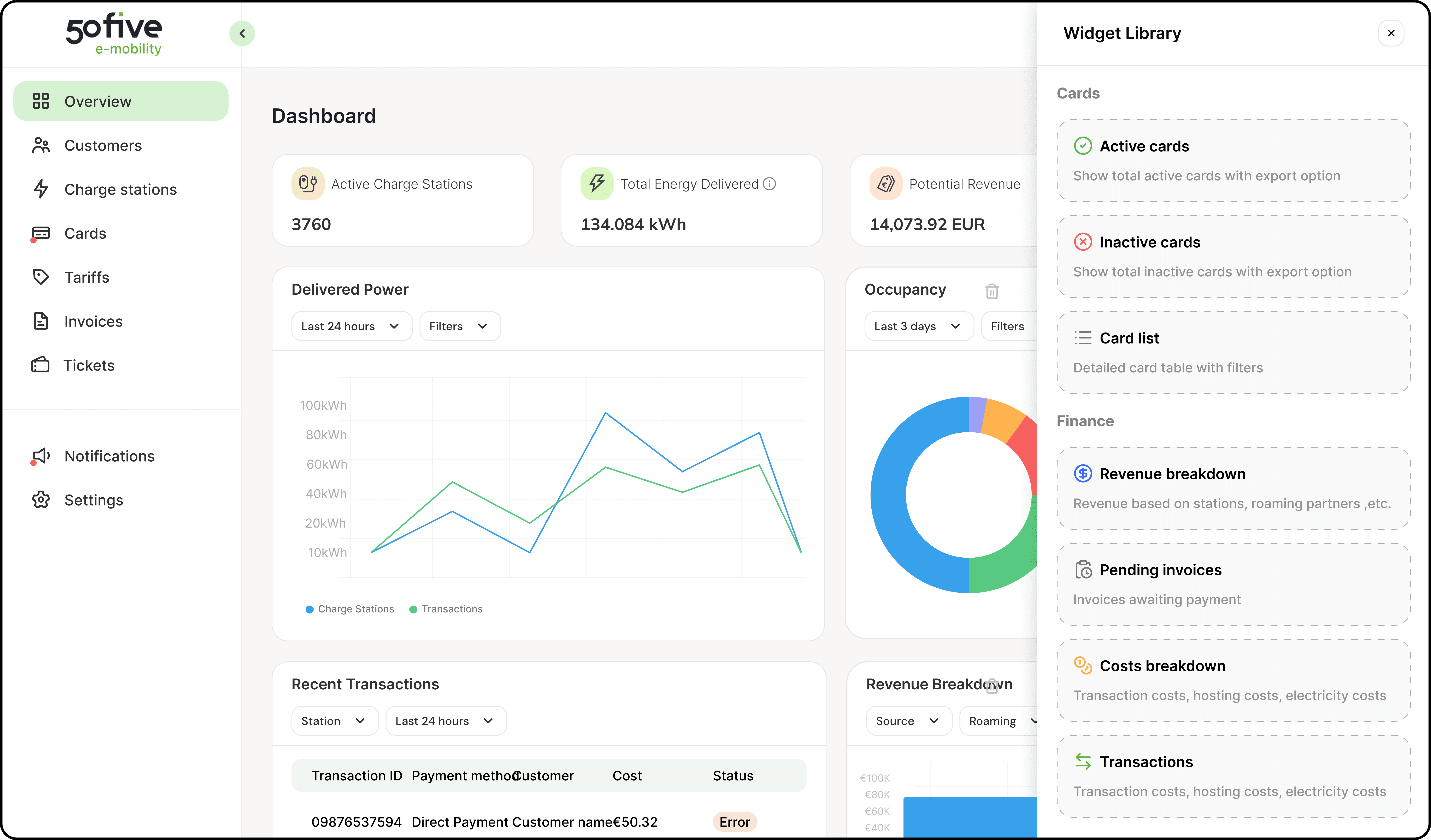 Individual overviews for Cards, Stations, Customers, etc.