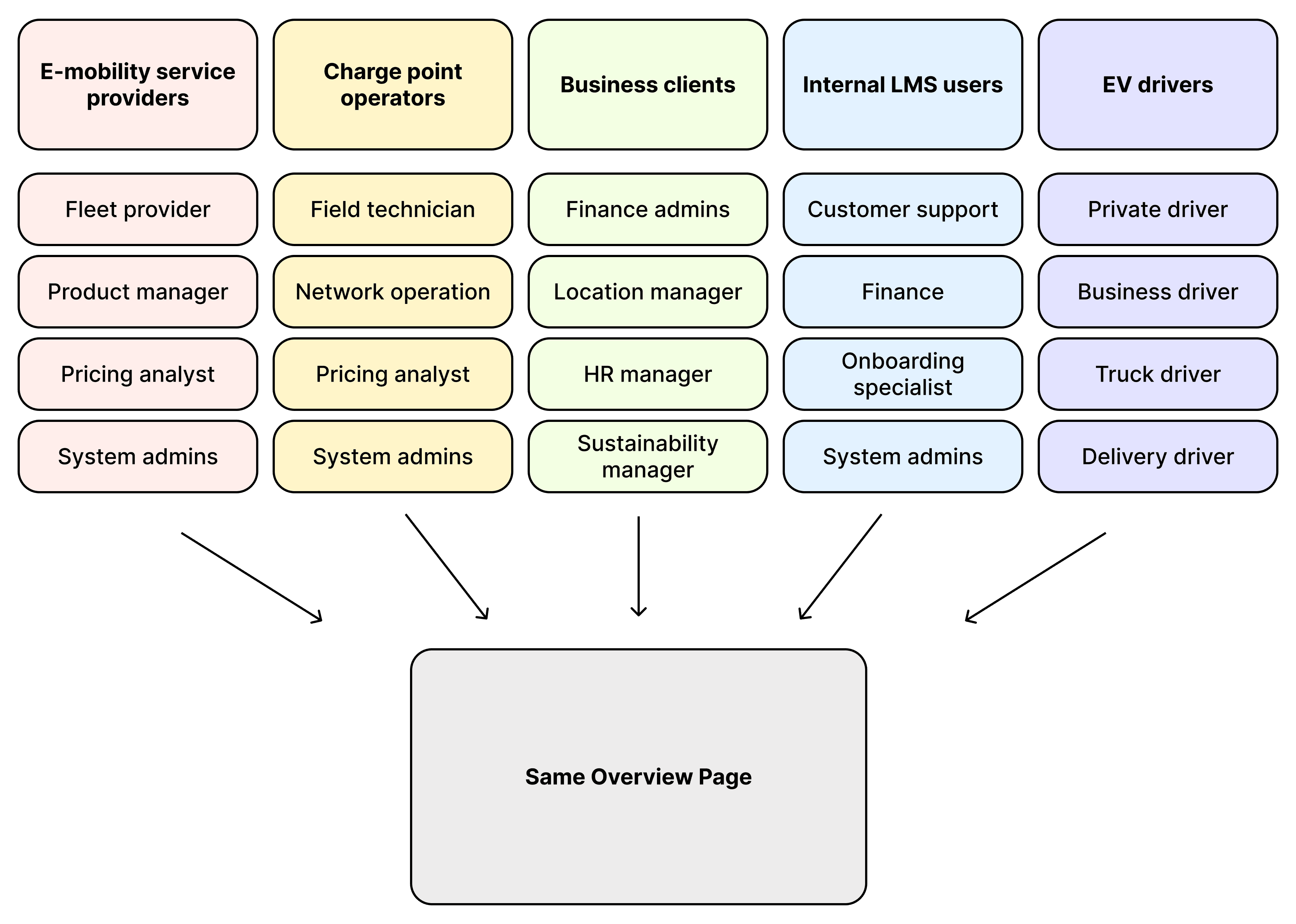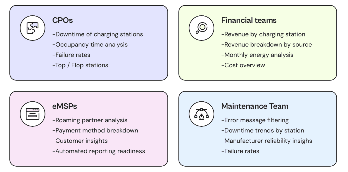 Charge Point Operators, eMSPs, financial analysts, customer success teams, and end users — each with very different goals, metrics, and daily decisions.